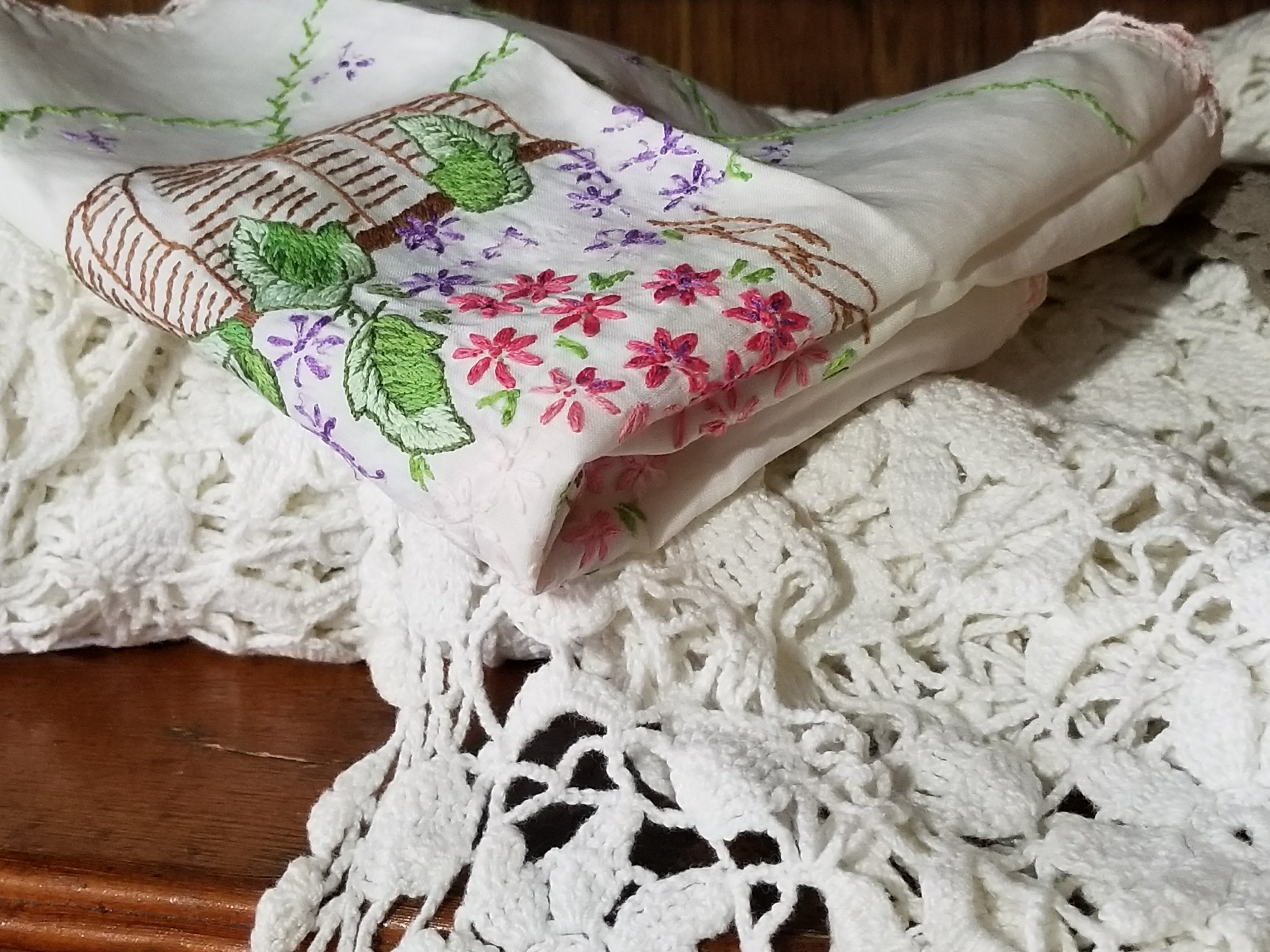 What I never saw her do was embroider. The embroidery in the photo is most likely done by my great aunt. She was highly skilled at embroider and crochet. I remember meeting her only once; the only time I ever accompanied my parents for the long drive up to my great-grandparents’ homestead. I remember her showing me how to use her spinning wheel, so I know she spun wool, too. After she passed away, a cousin of mine hung onto some of her work for years before she was able to pass them on to me, knowing I would appreciate them. And I do. They are among my treasurers.