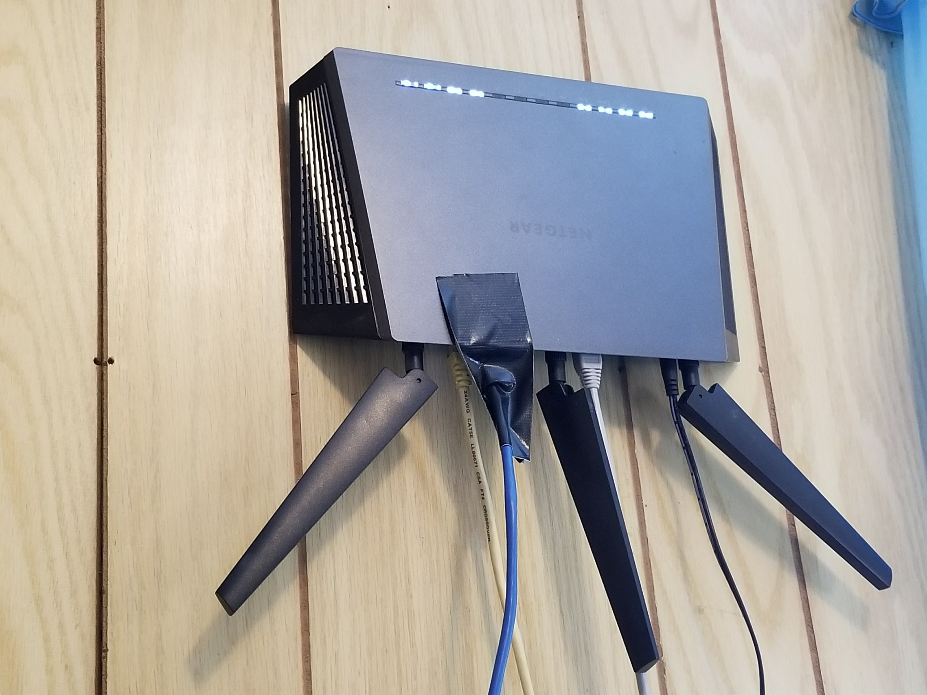 Unfortunately, both ends of the cable have had the little plastic bits that lock it into the port broken off. That’s not a problem at the laptop end, but the router is mounted on the wall, so the cable would eventually fall out, just from its own weight.