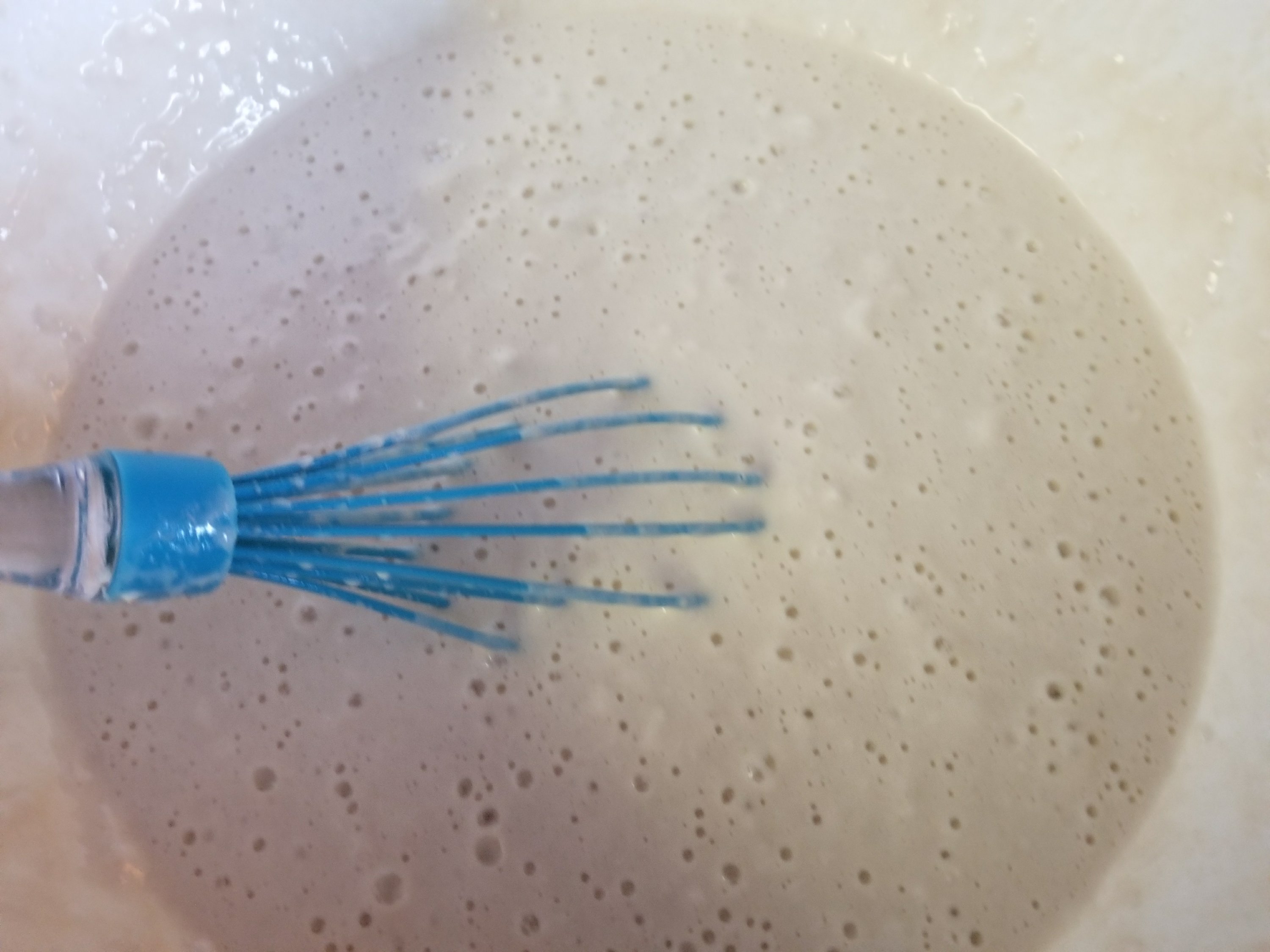 This morning was our first use of the sourdough starter, to make some basic pancakes.