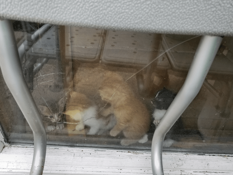 All four of Butterscotch’s kittens! Three of them had squeezed their way between the window and the dresser I use as a tool chest, and the fourth came up to join them.
