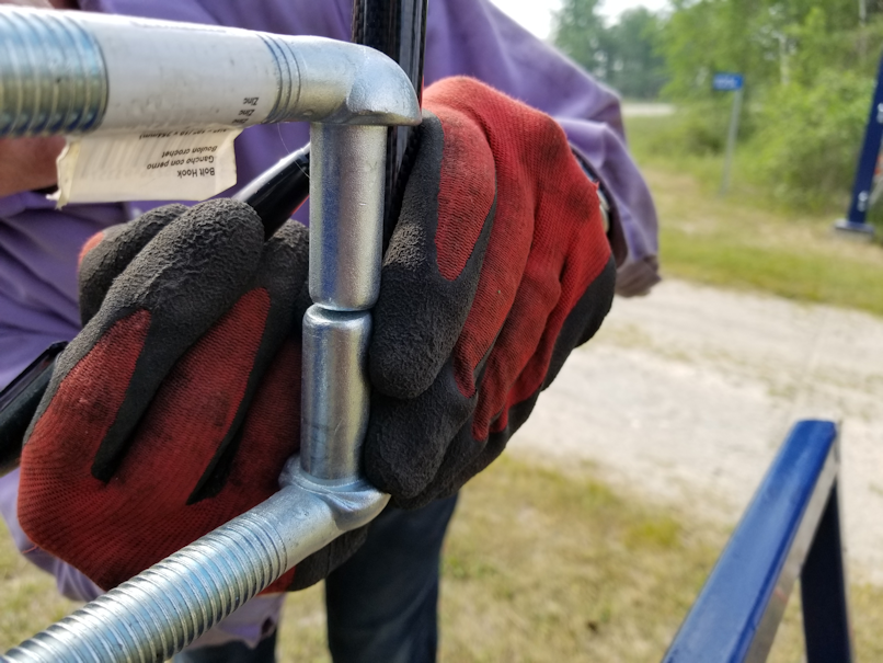 Duct tape was wrapped around the hinge pins to keep them from spinning around and moving while we tried to insert them into the posts.