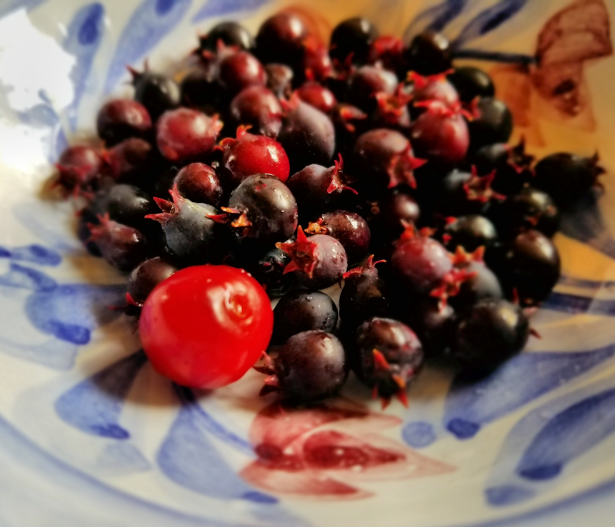 This is what I gathered this morning; the one cherry, and a handful of Saskatoons.