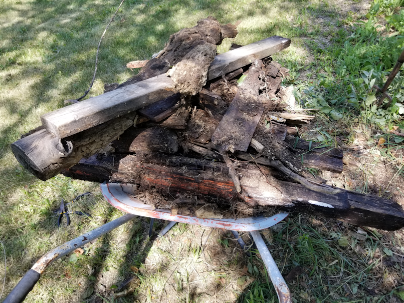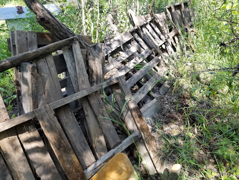 The pallets that were solid enough to carry are now near the junk pile outside the yard, and the more rotten stuff went into the wheelbarrow. All of this has lots of nails, so they will be burned in the burn barrel, when I have the chance.