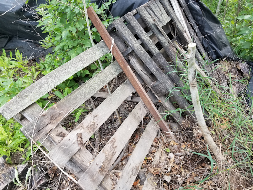 After dragging off more pallets, I started on what was on the ground. These pallets are so rotten, they came apart in pieces. I had to use a metal rake to clear debris from what was left behind, and used my potato fork to try and lift the buried boards, most of which just disintegrated.