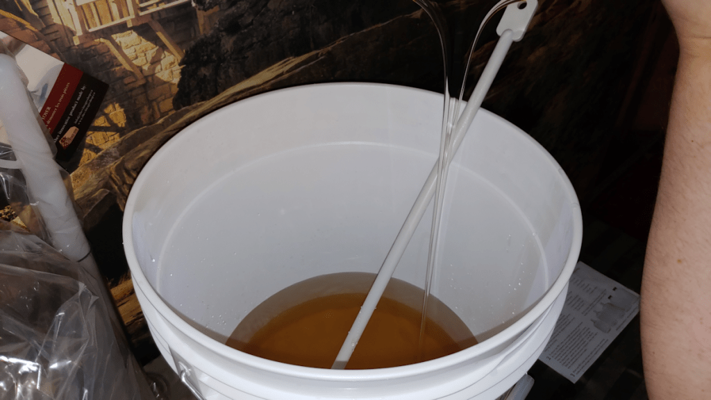 After sanitizing the bucket and stirring spoon, we started the must by adding some hot water to the bottom of the bucket first, then pouring in the honey.