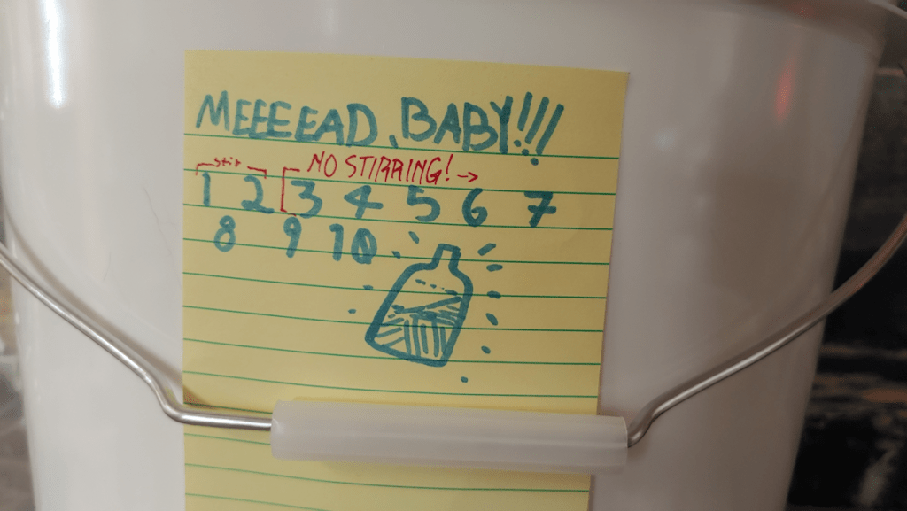 For this first fermentation, it will be stirred twice a day for the first 48 hours, then left to sit. At 10 days, it will be siphoned into the sanitized carboy, leaving behind any sediment that settled to the bottom of the bucket. It will then be sealed with an airlock and left in the basement for at least 4 weeks.