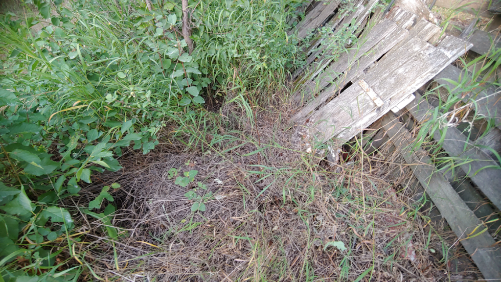 Disgusting carpet now gone, I started trimming on the other side of the pallet fence. There are a lot of thing leaning against it on this side, so I can’t take it away without getting rid of those, first.
