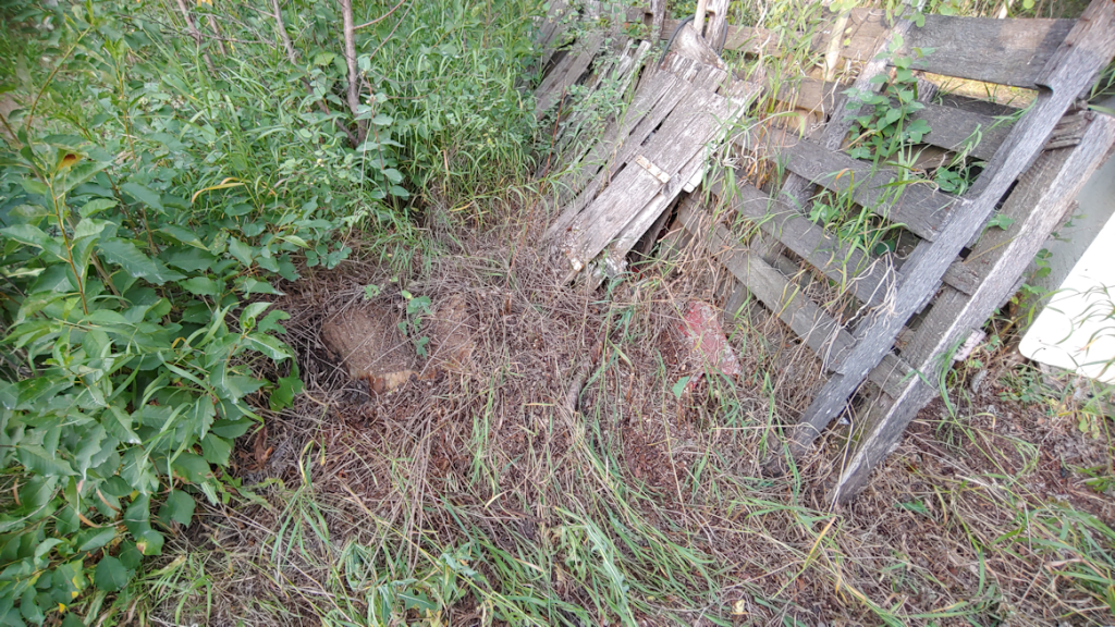 I made no attempt to get at the pallets on the ground at this point. Instead, I focused on using the pruning sheers to cut away the many small things growing there – raspberry bushes, cherry trees, elm, saskatoon, poplar, and quack grass so tall and strong, I was cutting them with sheers, too! The only thing I moved away from here was the one pallet standing up in the middle. The rest still have posts or trees running through them.