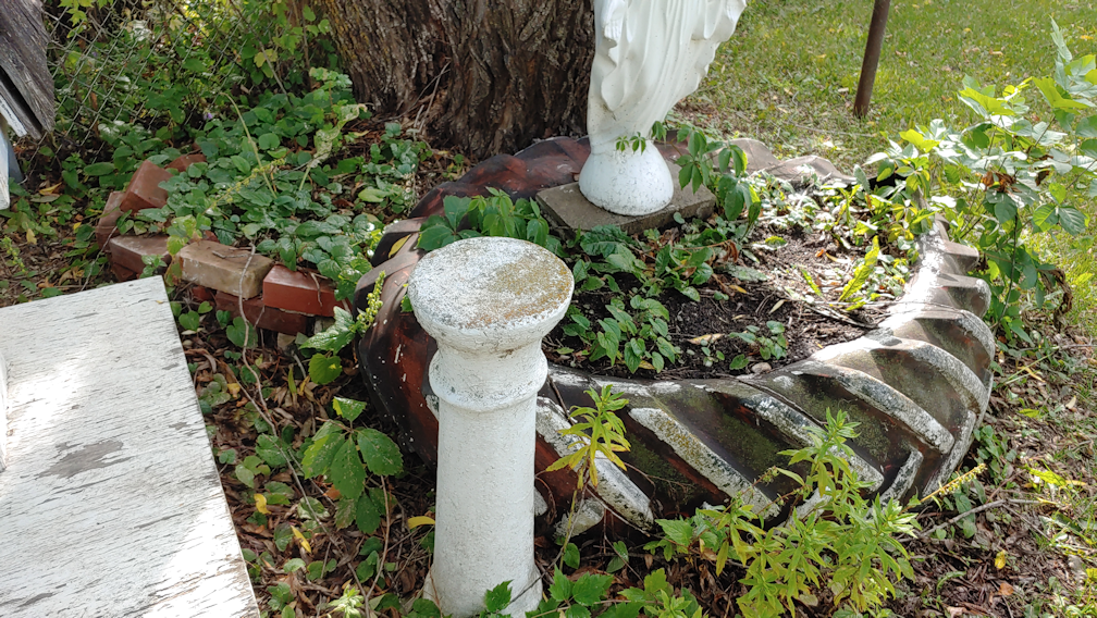 From this side, you can see how the willow has grown into the tire, causing it to bend. It’s even pushing the concrete block enough that the statue is at an angle.