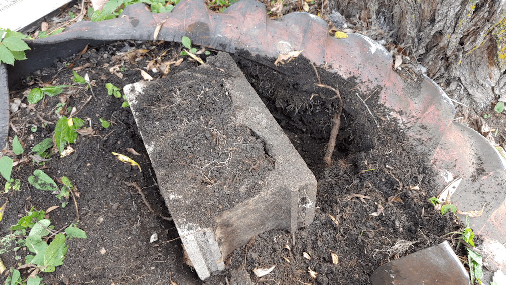 This is as far as I got, today. I am guessing I got about 2/3rds of the soil out, but it’s hard to say. As I loosen the soil, I sometimes hit what I think is a root from the willow tree. I was able to start lifting the tire off the ground from the outside a bit. I’m hoping to get it to a point where I can lift it up and move it around to knock the last of the soil caught inside the tire itself. Once it’s out of the way, I’ll be able to see what I’m dealing with underneath. Mostly, I just want to get rid of as many vine roots as I can, trim that stump further down, then rake the whole thing smooth.