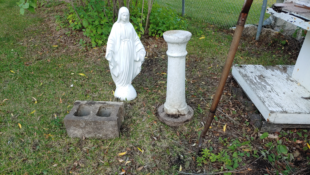 I’m not sure what I will do with these. After I give it a good cleaning, I want to set the statue up somewhere nice and visible, and the concrete block makes a good foundation for that. The pedestal is the perfect size for the statue; I’m sure they were purchased together. I feel it would not be stable enough for the statue, though – especially with rambunctious kittens running around – so I want to find some other use for it.