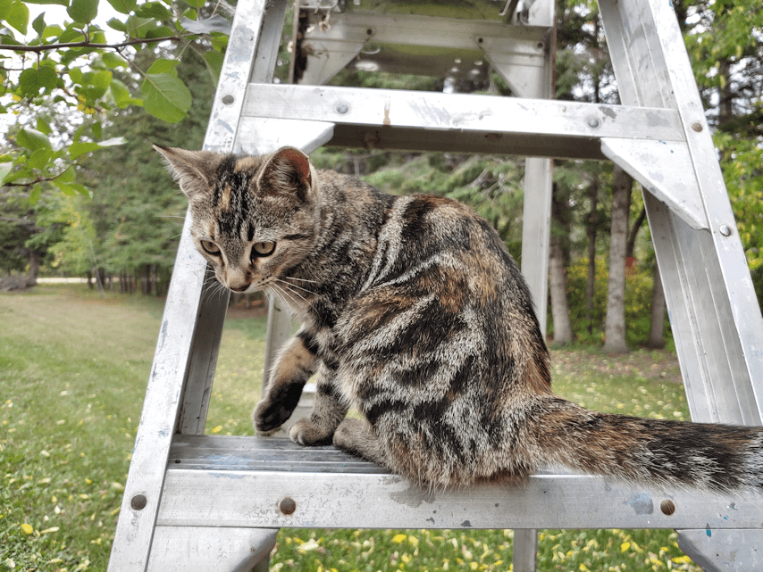 A partially black cat getting ready to jump down and walk under a ladder. That can’t be good… :D :D :D