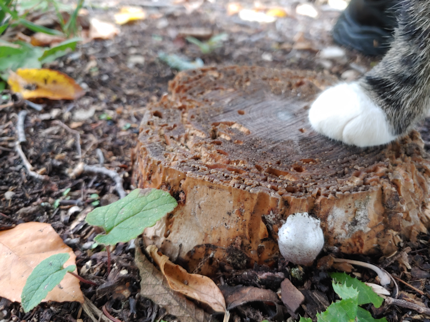 I almost missed it at first, thinking it was a pebble! The stump it is growing on is from an old spruce tree. This mushroom might be a puff ball mushroom. I haven’t seen one of those in many years! I used to see them quite often in one particular area, when I was a kid. My later brother and I used to have a blast, finding the ones that were ready to spawn and stomping on them, causing them to explode in clouds of spawn that would drift away.