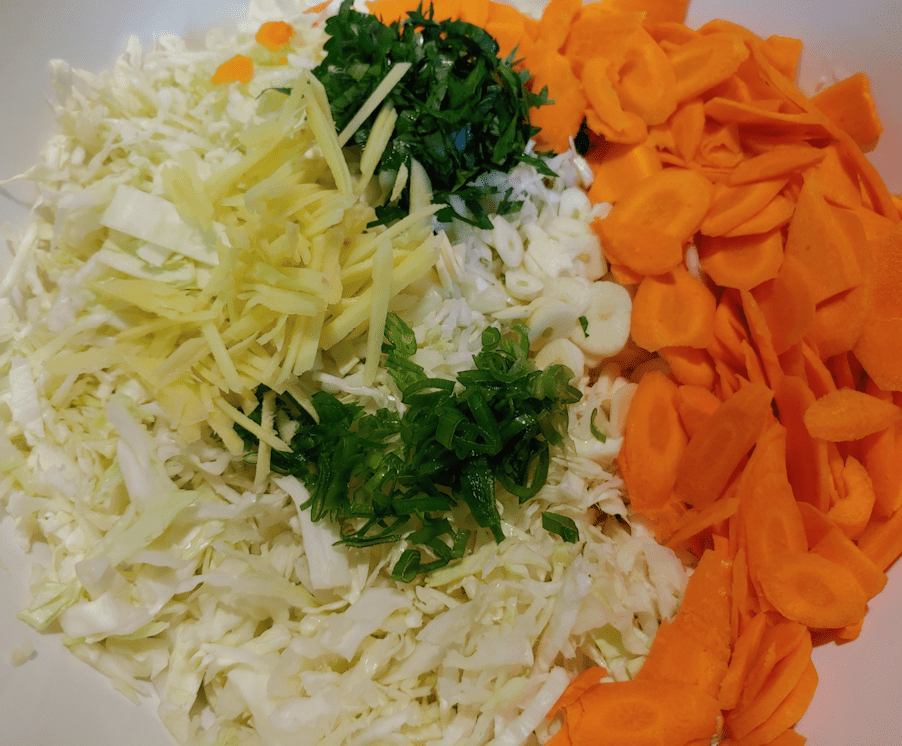 Finely slice or chop the green onion, parsley leaves, ginger and garlic. Add to the sliced cabbage. Mix the ingredients until evenly distributed.