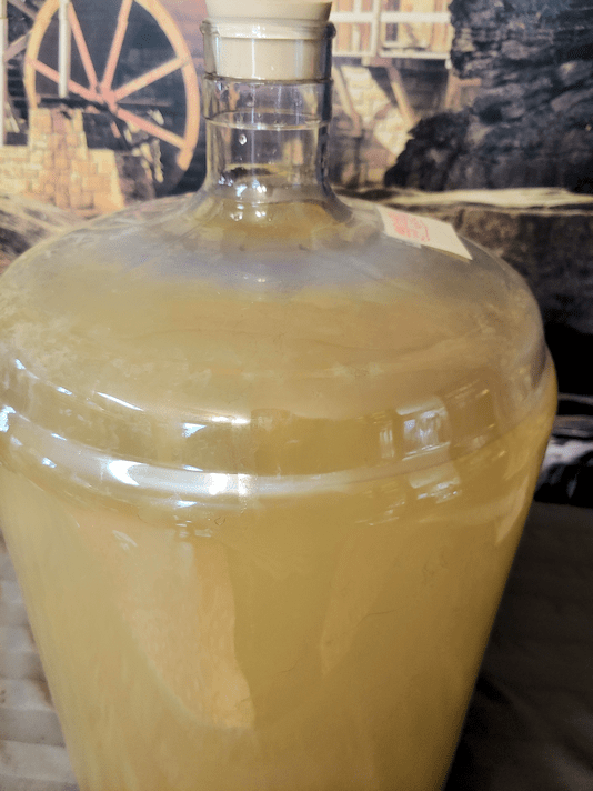 The mead was left in its second fermentation for longer than 4 weeks, but it seemed to have stopped fermenting much earlier. It’s really hard to see the airlock where we kept it – we basically had to shine a light at it – but there didn’t seem to be any bubbles in the water.