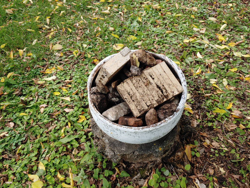 I’m still leaving the old cream separator basin my mother used as a planter, on the stump, since it keeps the stump nice and visible, even when buried in snow. I used most of the soil in it for transplants, so I put the broken pieces of bricks and any stones I found into it. I think we’ll be able to make use of them, so I don’t want to just add them to the junk pile.