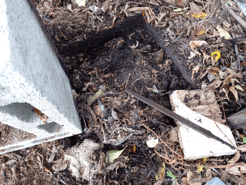 Once I was relatively confident that I’d removed all the broken bits of bricks, rocks, pieces of glass, plastic, twine and miscellaneous other bits of debris, I racked the dirt and leaves back to fill in the indentations and level it off.