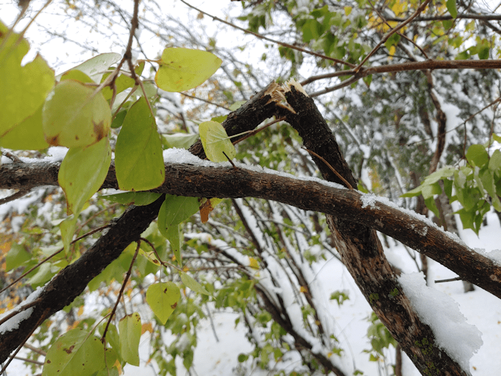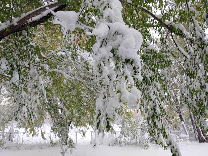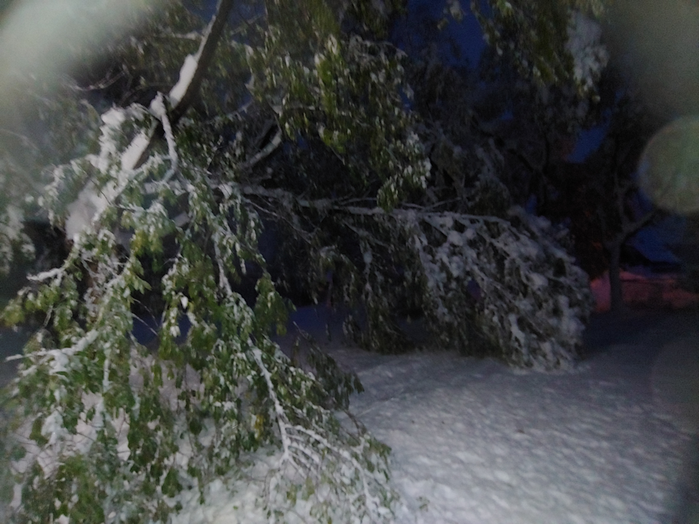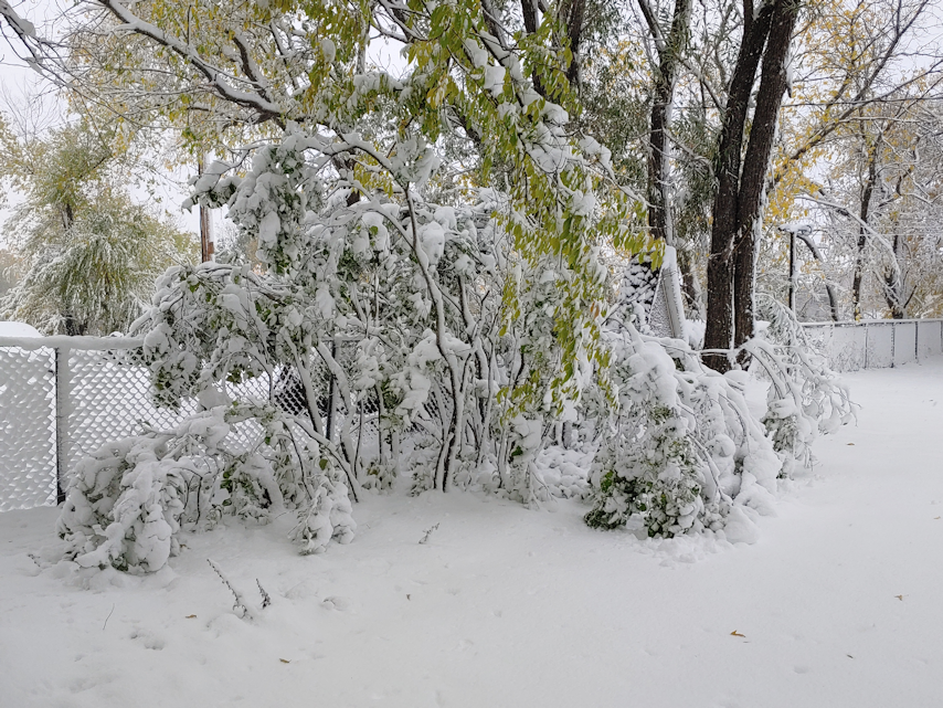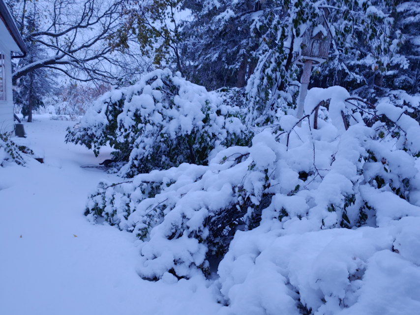There were more branches down, though none as big as the one that fell in front of the door. The lilacs were hit pretty hard. They all had so many leaves still on them, which meant they got more of that heavy, wet snow stuck on them and dragging them down.