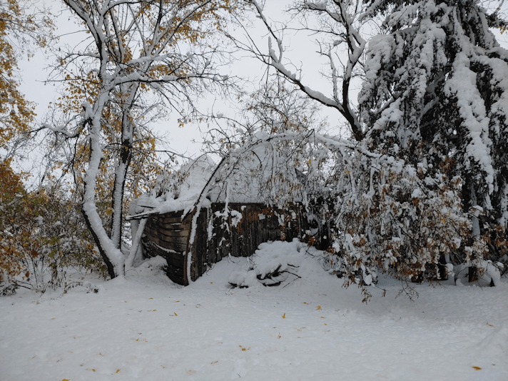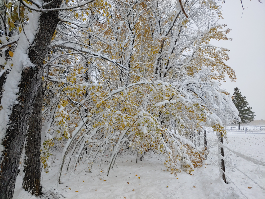 The living fence my mother had planted was all bent over, too. The tops of the hawthorn and caragana were stuck, buried under the snow. Each one needed to be freed before I could shake off the snow and they could straighten themselves.