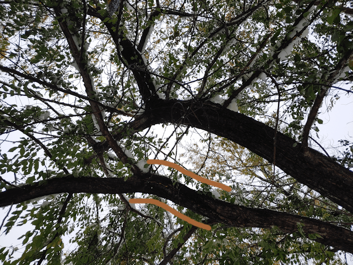 As for the elm outside our kitchen window, I kept going back to it. The large branch overhanging the walkway did not lift up much after the snow was knocked off, and we continue to have to walk through parts of it as we use the walkway.