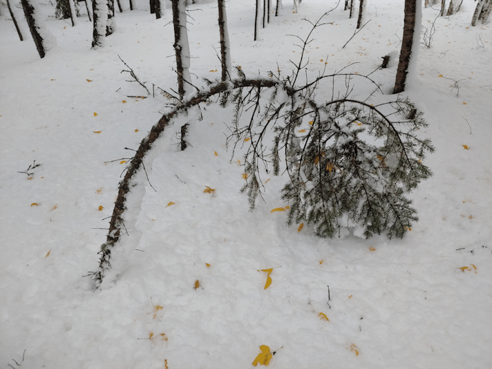 Seeing the little spruce tree bent over like that was surprise enough, but to see the much bigger maple by the old log building bent over like that was even more of a surprise!