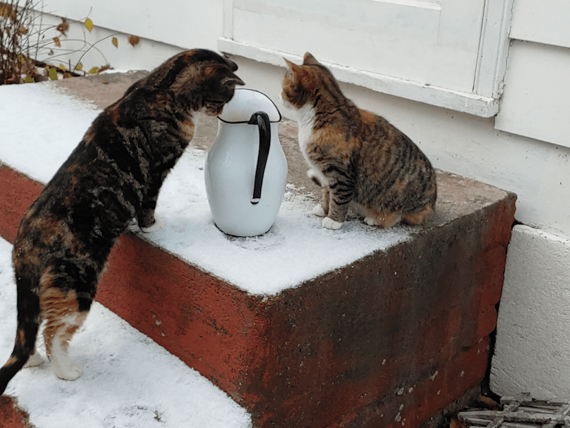 As the weather has gotten colder, seasonal changes are happening to our morning routine. With the outside taps now closed for the winter, and water starting to freeze, we are back to bringing out a pitcher of warm water to refill the cat bowls outside.