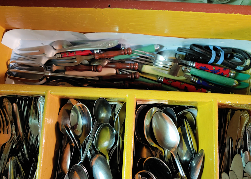 There’s a power cord, probably from a kettle. A single beater for an electric mixer. There’s a knife with a strange, tiny, narrow blade on it. A serving fork. A tarnished silver souvenir spoon from Mexico. An unopened package of three small knives with serrated edges on both sides (grapefruit knives, maybe?), what appear to be a bunch of wood handled cocktail forks, and cutlery with brightly coloured plastic handles.