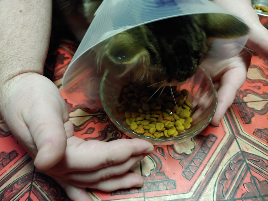 With the cone we discovered that, of the 10 bowls we have for our 5 cats (half for dry kibble, half for wet food), he could only eat out of the 2 glass ones. Even then, my daughter ended up having to hold the bowl, because he kept pushing it forward with the cone!
