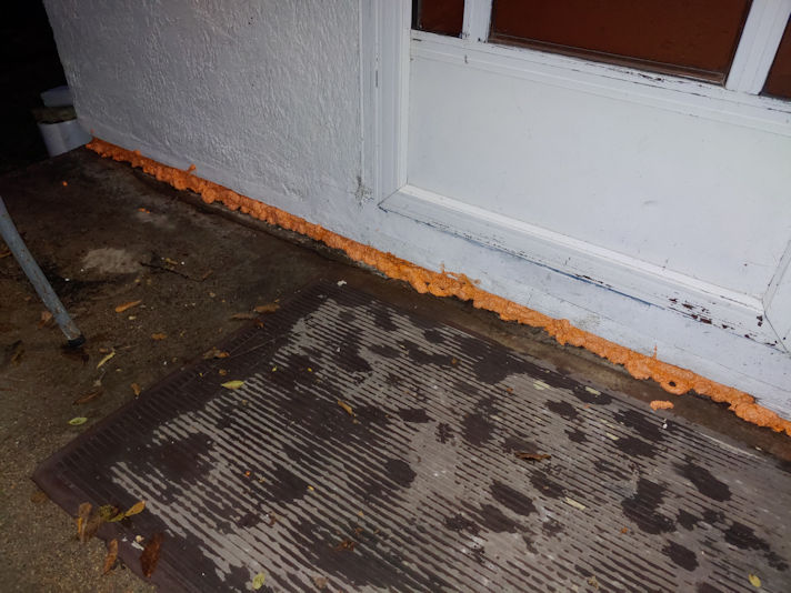 The wider portions of the gap seem to have filled quite well. It’s really messy, with lots of gaps at the surface, but the space under the stucco is filled. It would have expanded down, between the concrete steps and the basement wall, as well – I made sure to get the foam all the way to the back of the gap, which is what took up most of the can! So there is actually quite a bit more foam here than is visible.