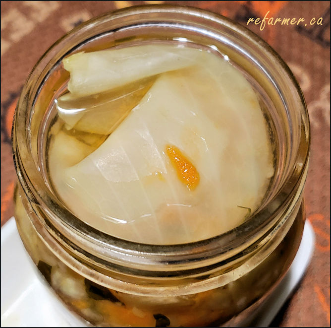 After what happened last time, I did check the brine levels twice during fermentation. Both times, I did add just a little bit of water, which had been boiled first, because the cabbage leaf covering the sauerkraut was starting to get dry. No sign of mold, though, so that was good!