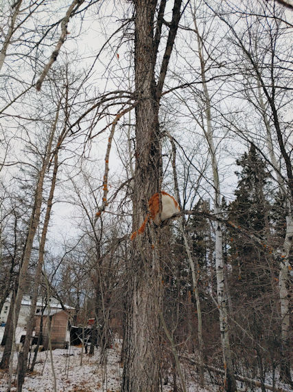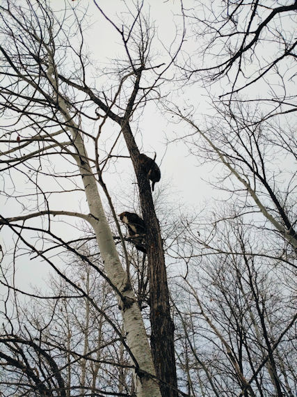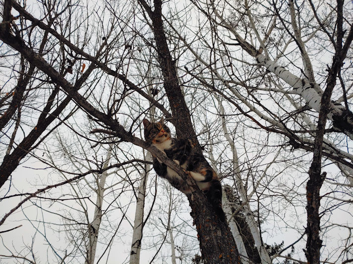 Even Junk Pile cat had been following along and was up a tree, but before I could get a picture, he’d jumped down and bolted further into the grove.