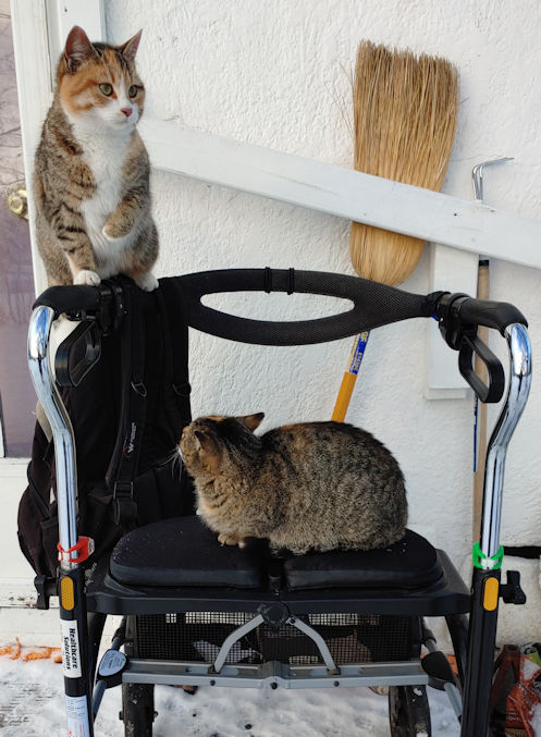The cats just love walkers! Beep Beep (on the seat) used to do this when my dad went outside with his water, too. :-D