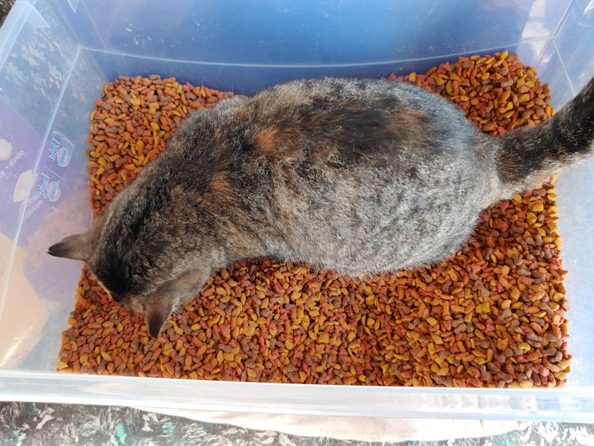 Also, as I didn’t have to go anywhere early in the morning, it was actually daylight when I started my rounds, and I could get some photos. I always start with bringing fresh water to the cats, and topping up their food bowls.