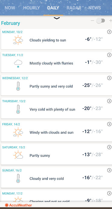 Yesterday, it was saying a high of -2C (28F) and a low of -28C (-18F). Now it’s saying -1C (30F) for a high, and -30C (-22F) for the low!
