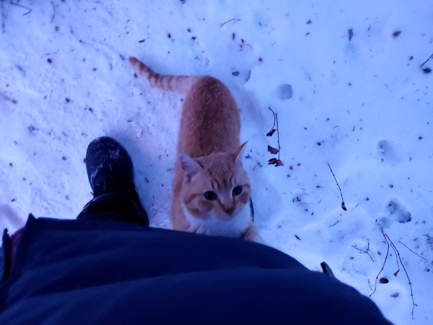 It’s been warming up for the past few days, which means I had plenty of company while doing my rounds this morning. Butterscotch, as usual, wanted to be carried, while three others followed along.
