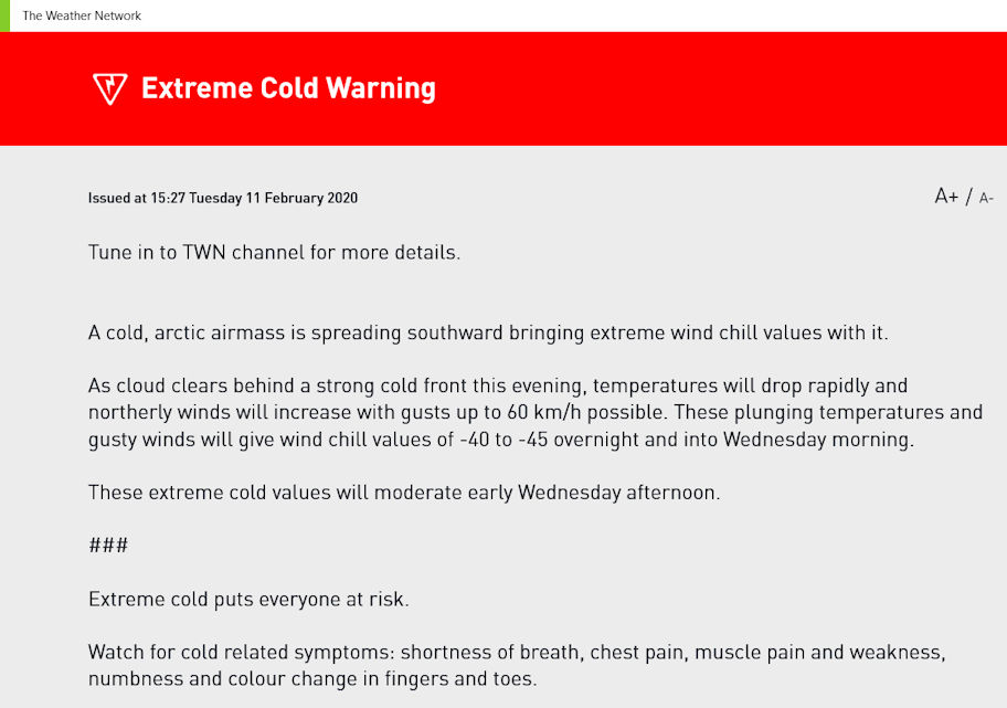 Our current mild temperatures (we are at -3C/26F with a wind chill of -10C/14F as I write this) are supposed to slowly drop until about midnight, then the winds are going to hit. Locally, by tomorrow morning, we’re supposed to hit -29C (-20F), with the wind chill bringing it down to -43C (-45F).
