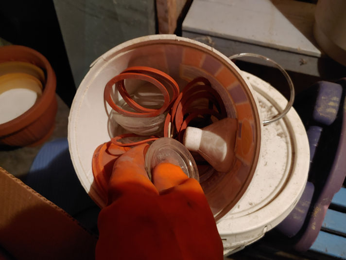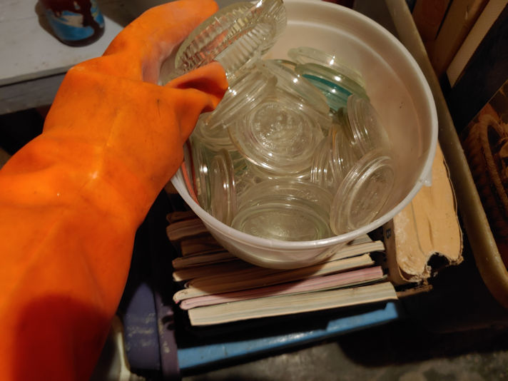 In a couple of old buckets, I found glass canning lids. One of them had rubber seals, too – stiff and brittle with age. These were set aside and I will go through them another time. I’ll get rid of any chipped ones. I’ve found more of these in the old kitchen, and at some point, I’ll put them all together, along with all the jars all over the place, and see what can be salvaged or repurposed in some way.
