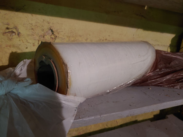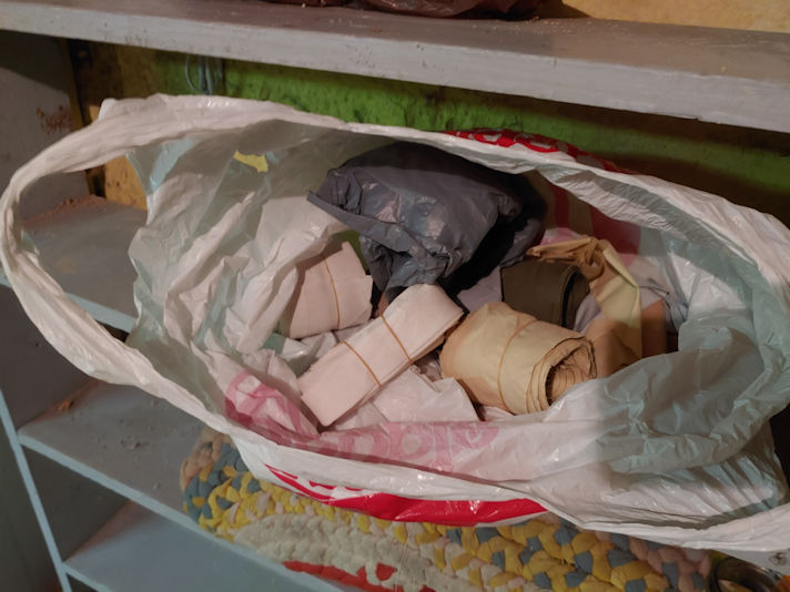 These are just a few of the things I found carefully wrapped in plastic. Strips of fabric, all rolled up and held in place with elastic bands. Carefully rolled up bale twine (that’s in addition to the balls of twine that were sitting on other shelves). A giant roll of plastic food wrap.