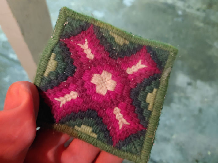 This is 4 way Bargello, made into a coaster. I made a set of 3 in three different designs, and gave them to my mother. My oldest daughter helped stitch them. She was just a toddler at the time, but had enough motor control to put the needle into the right space in the canvas, so she worked the needle from the top, while I worked it from the bottom.