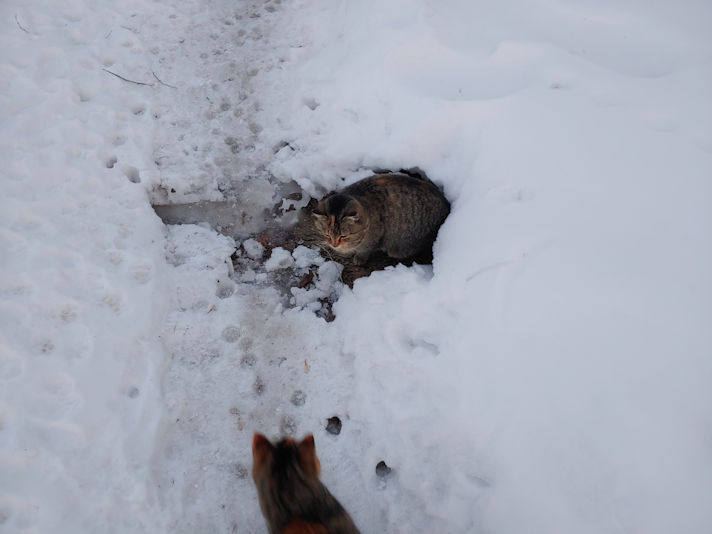 Some of the water that got into the basement drained into the sump pump reservoir enough to trigger it. Which means that, outside, there’s a melted patch in the snow.