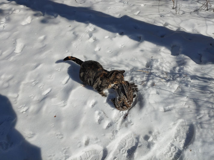Butterscotch had followed me, and once she realized what I’d left in the snow, she claimed it! This bird is big enough to feed at least a couple of cats, so I expect others will enjoy a feast, too.