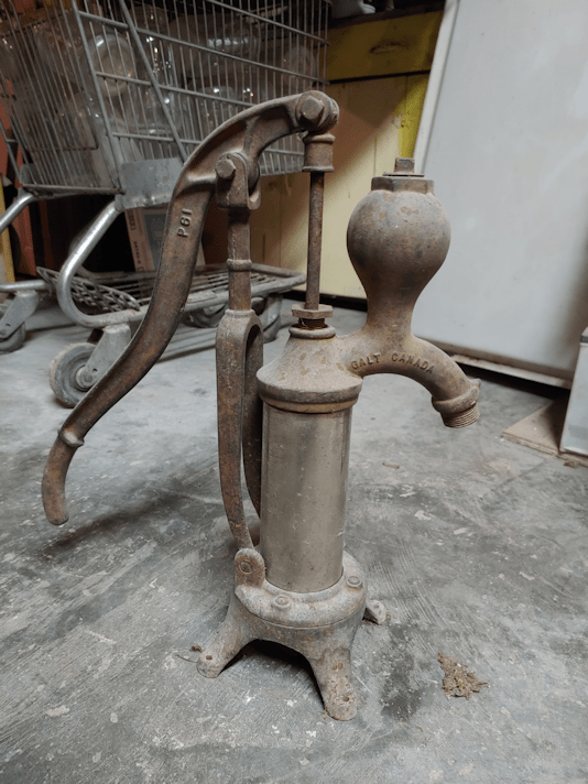 I didn’t take a look, but it likely attaches to a pipe from below. My guess is that it is a kitchen water pump that would have drawn water from a cistern beneath it. I know a building my parents bought, intending it to be an investment property (that didn’t pan out…) had a cistern in the basement that collected rainwater, and they had a hand pump in the kitchen. By the time I remember any of that, the cistern, which was basically a bricked off room in the basement, had a doorway cut into it, and was where the well and pressure pumps were installed, after my parents had a well dug and running water installed. For all I know, this pump is from that building! if it is, it probably dates from around the 40’s or 50’s. If it isn’t… then I have no clue!