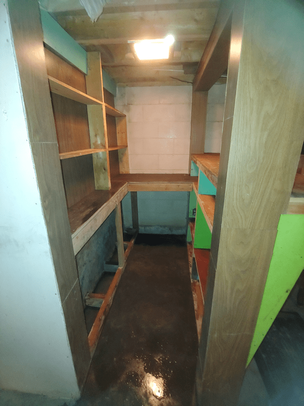 Once it’s all dry, we’ll use this to store things we want to protect from the cats, but don’t want to store in the old part basement. We’ll be making a “door” across the front, and I hope to pick up some wire mesh tomorrow, that we can use to cover the counter area to keep the cats out.