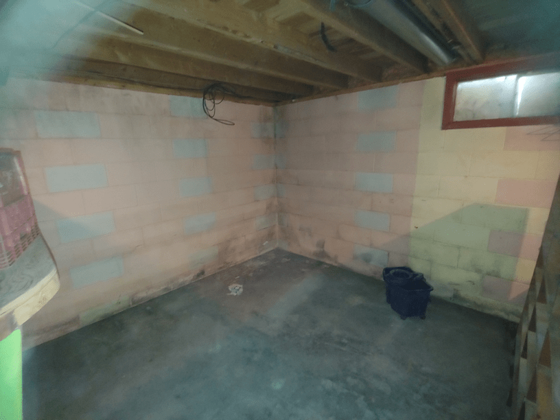 This damage would have happened shortly before we moved here, when my older brother discovered flooding in the basement from a rain barrel at the corner that was left to overflow for months of rain. The corner had even started to mold, and he’d had to move things away from the walls so he could scrub and bleach the area.