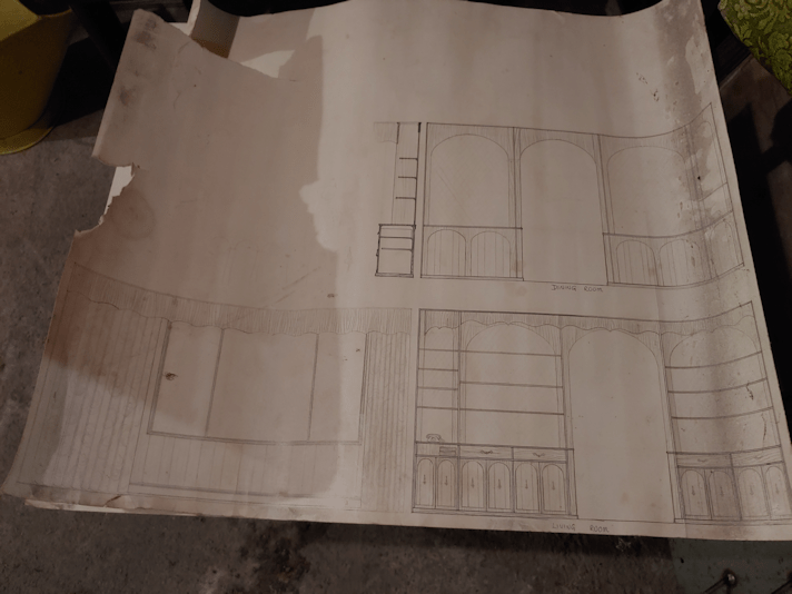 I’m guessing my sister drew these plans. I think she still freelances plans and blueprints for people, but these days, she uses a computer. :-D I think these might be the original plans for the shelves that now divide the living and dining rooms! The end result wasn’t quite so fancy (I love the addition of a little rotary dial telephone), but I can see how what we have now could have developed from these plans.