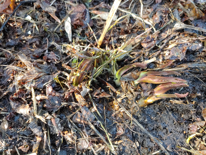 After scraping aside last year’s leaves, I found the horseradish has already been trying to grow.