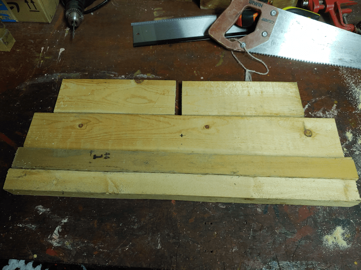 There was just enough of the wood we used to build a frame to block the entry into the old basement, to cut 2 ft long side pieces. One of them is missing a chunk at one end, but it’ll do. I then cut a matching 2 ft long cross piece for the top, and a pair of base pieces.
