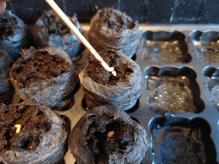 Once the pellets were hydrated, I used a pair of shorter bamboo skewers to lift up the mesh at the top, because I know my clumsy fingers would just tear things. *L* Then, I used the blunt end of a skewer to push the seeds to the right depth into the loosened pellets.