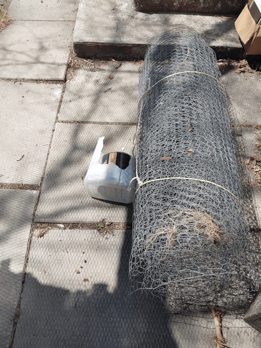 The chicken wire belongs to the goat’s owner, so that’s all rolled up and, along with the containers he brought to try and lure the goat with food, it is set aside and ready to be returned.