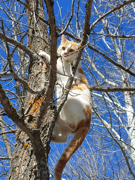 He’s about 10 feet above my head in this photo! Of all the cats, he seems to be the one who loves to climb the most. :-D